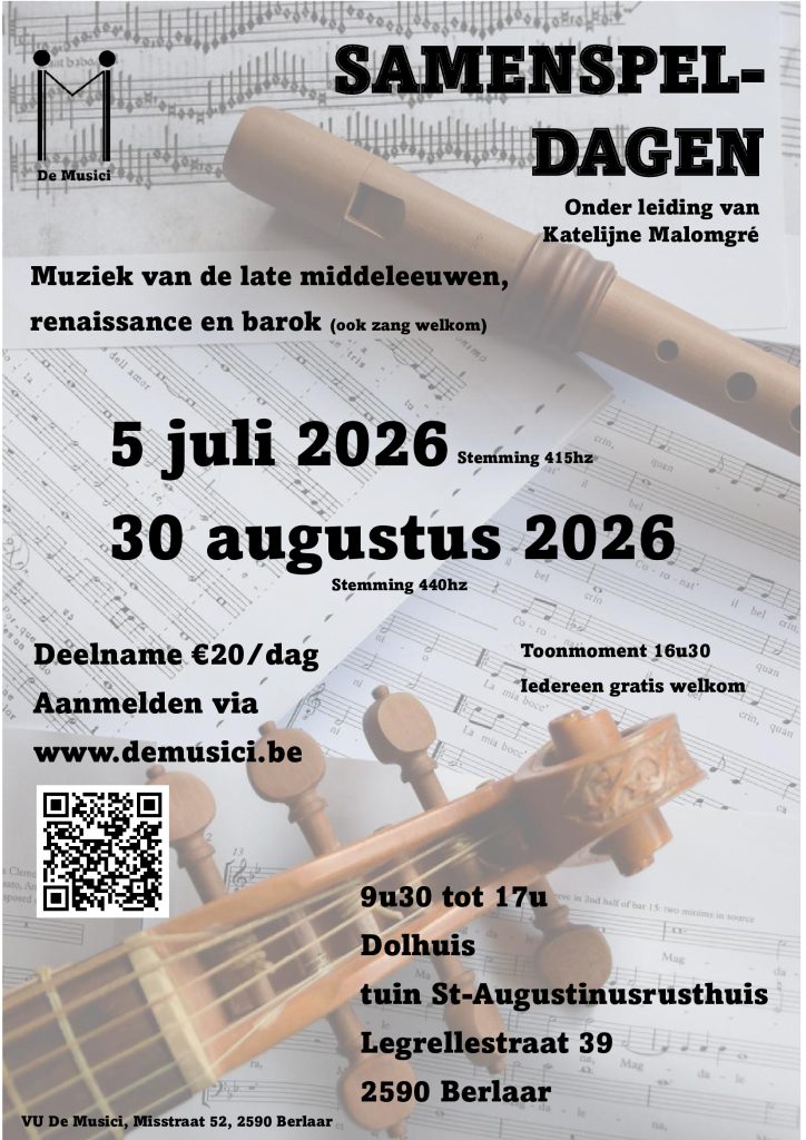 Onze eerste samenspeldagen gingen door in de Begijnhofkerk in Mechelen en zijn gericht aan alle liefhebbers van muziek uit de late middeleeuwen, de renaissance en de barok. Dat laatste blijft, de locatie is intussen aangepast: we verwelkomen jullie vanaf 2026 in het Dolhuis in Berlaar bij Lier. Ongeacht het niveau zijn alle muzikanten en zangers welkom om deel te nemen. Samen met dirigente Katelijne Malomgré zoeken we geschikte muziekstukken uit die we een maand voor de datum aan iedereen bezorgen. Zo kan iedereen zich voldoende voorbereiden om de dag zelf fijn samen te musiceren. Het doel: samen onze passie delen, op laagdrempelig niveau bijleren en gelijkgestemden ontmoeten.